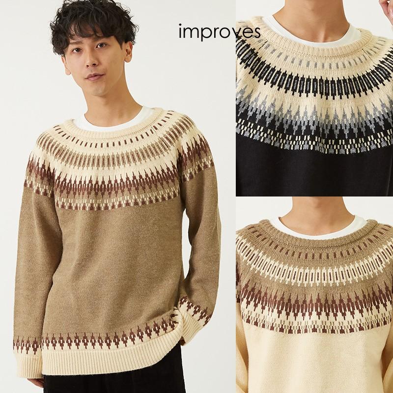 セーター メンズ ノルディック柄 クルーネック ニットセーター ゆったり オーバーサイズ ドロップショルダー 大きいサイズ 長袖 黒 Improves Improves インプローブス 通販 Yahoo ショッピング